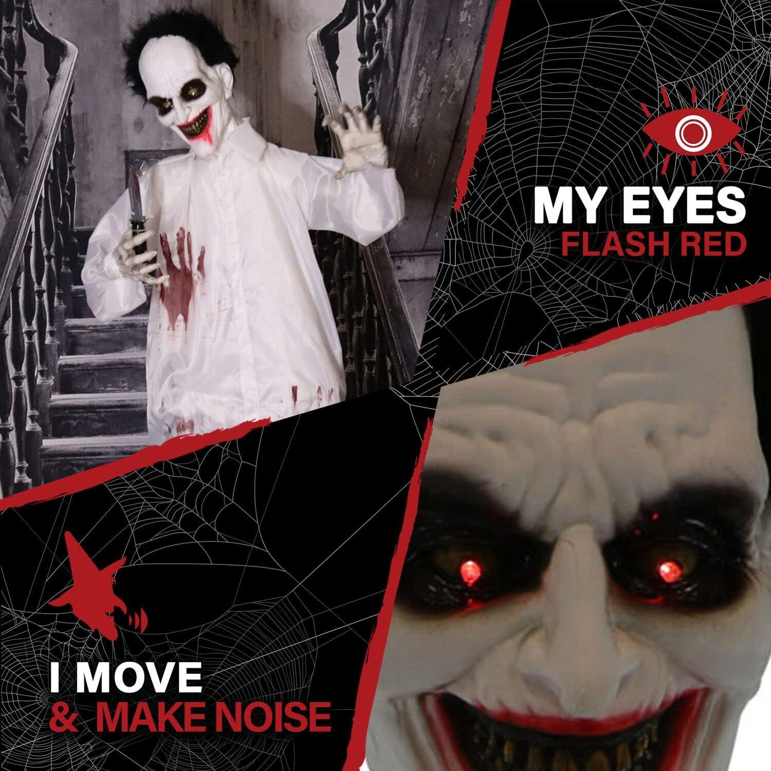 - Lights up and Moves: This animatronic halloween decoration moves side to side when bumped while his eyes flash in red LED lights