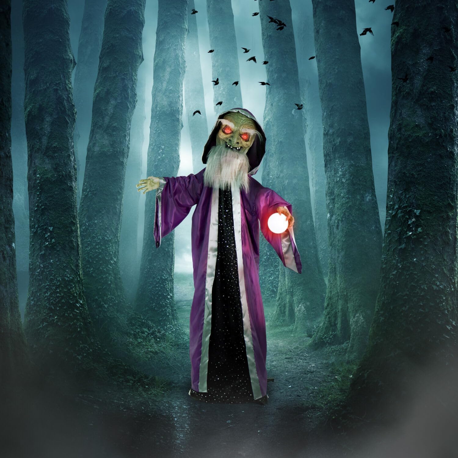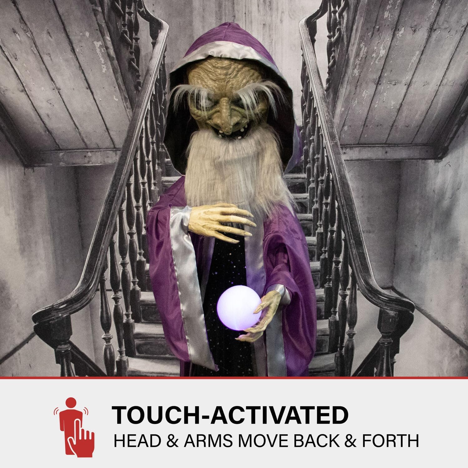 Haunted Hill Farm Talking Wizard Halloween Animatronic with Movement and Light-Up Crystal Ball for Scary Indoor or Covered Outdoor Halloween Decorations, Battery Operated Halloween Prop