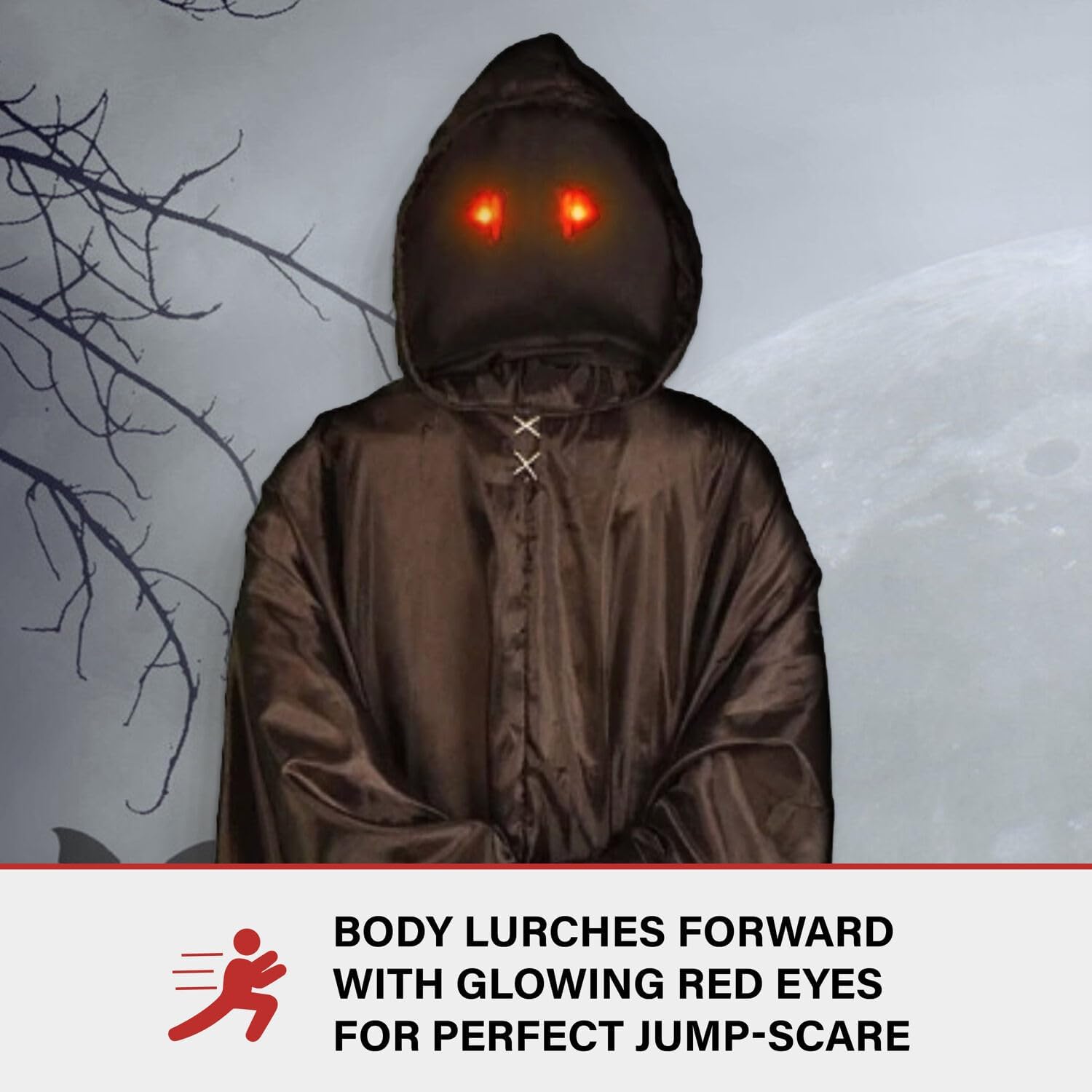 - Multi-Function Jump-Scare Prop: Abigar quietly hides in the shadows with his hands crossed, patiently waiting for his next victim; Suddenly, he lurches forward with glowing red eyes to snatch another poor soul for his deathly fold