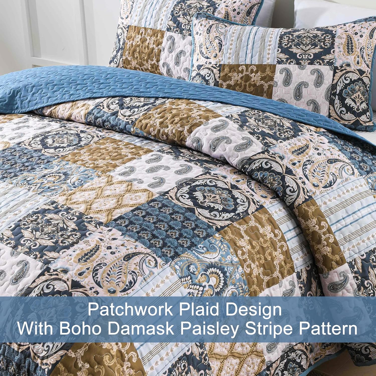 - PATCHWORK BOHO QUILT SET: The boho bedspread queen size bedding set featuring a patchwork plaid design. Combined with bohemian stripe damask and paisley pattern gives this bedspread coverlet a elegant atmosphere.