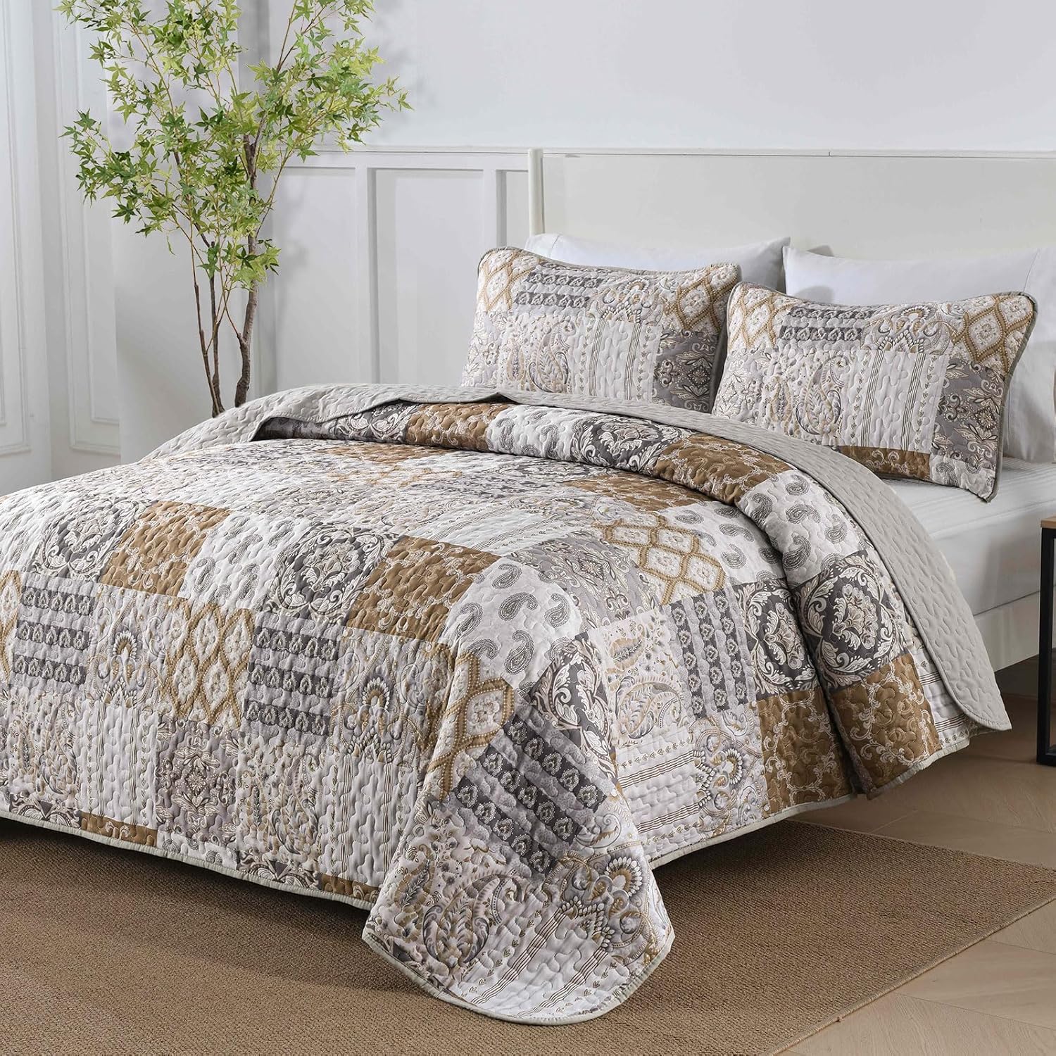 - SOFT MICROFIBER BEDDING SET: The cozy brown patchwork quilt queen size bedding is made from high-quality microfiber, our quilt sets queen is soft to touch, lightweight, and breathable. The firm stitch ensures long-lasting durability.