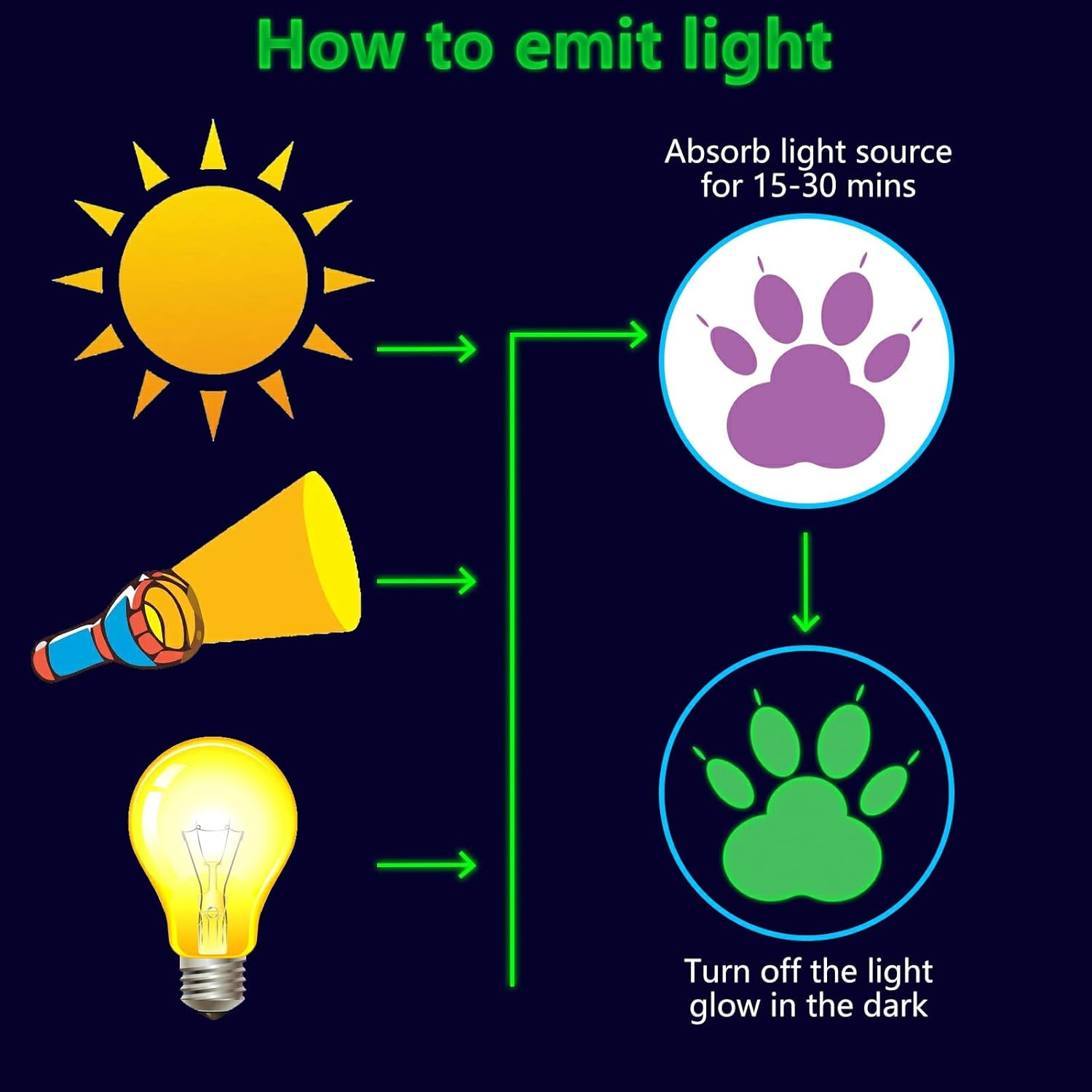 - ✦ Glow Paw Prints Wall Decals: These glow wall decals for ceiling are made of quality luminous material,they will glow brightly when absorb enough light during the day. You just need to put it under lamplight flashlight ,room light or sunshine for 15 minutes, it will keep glowing for 8-10 hours with a gentle green fluorescent light. Please ensure the light shines on the decals without obstruction, the longer it takes to absorb light, then to light up for up to longer.
